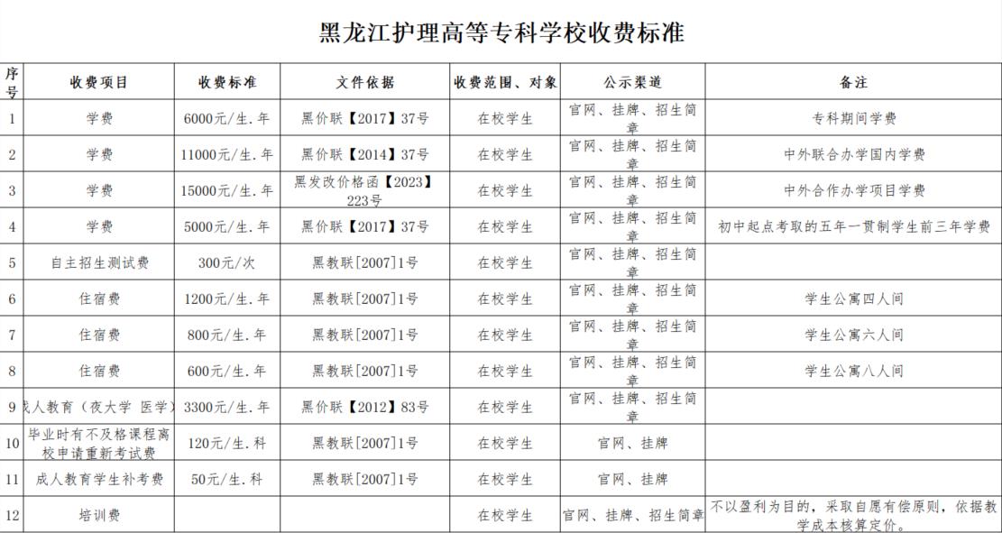 黑龙江护理高等专科学校2024年收费标准
