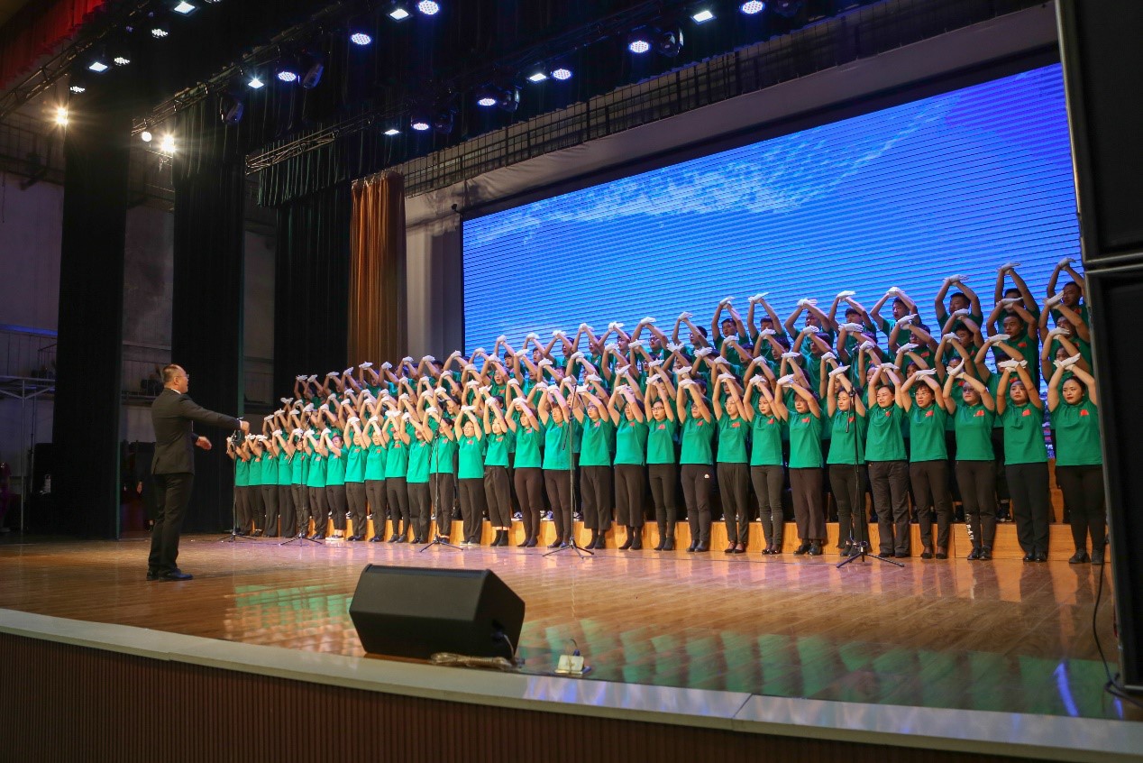 舞台上演唱者热情洋溢,声音洪亮;指挥手势专业,富有激情;台下观众掌声不断,一次次将演出推向高潮。在演出接近尾声的时候,全场观众起立,齐唱国歌,舞动国旗,现场师生们为这一抹鲜艳的红色热泪盈眶,为这熟悉的旋律声音哽咽。