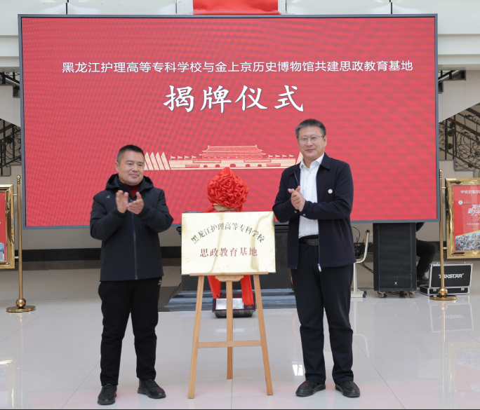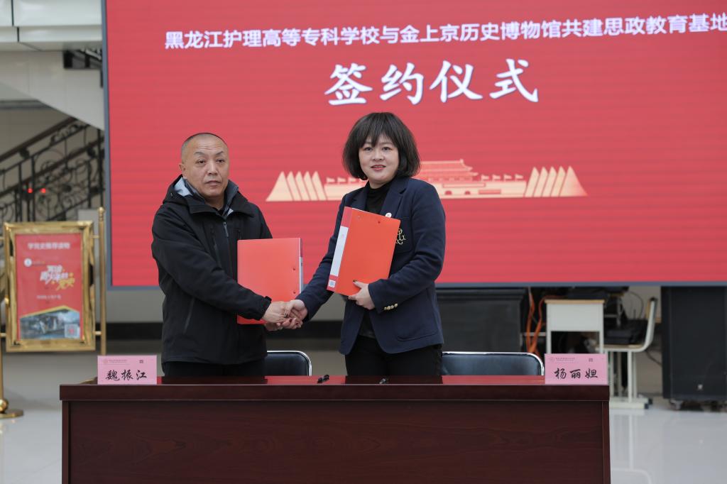 白山黑水镌刻千年文脉,金源故地激荡育人新声。11月12日,在阿城校区开展了黑龙江护理高等专科学校与金上京历史博物馆共建“思政教育基地”签约揭牌仪式暨党建联建活动。出席活动的校领导和嘉宾有校党委书记田国忠、党委副书记王敬春、副校长杨丽妲、纪委书记于新宇、副校长于沛君、金上京历史博物馆副馆长郭万勋、魏振江,学校宣传统战部、图书馆、护理系、药学系等党员师生代表参加了活动 。