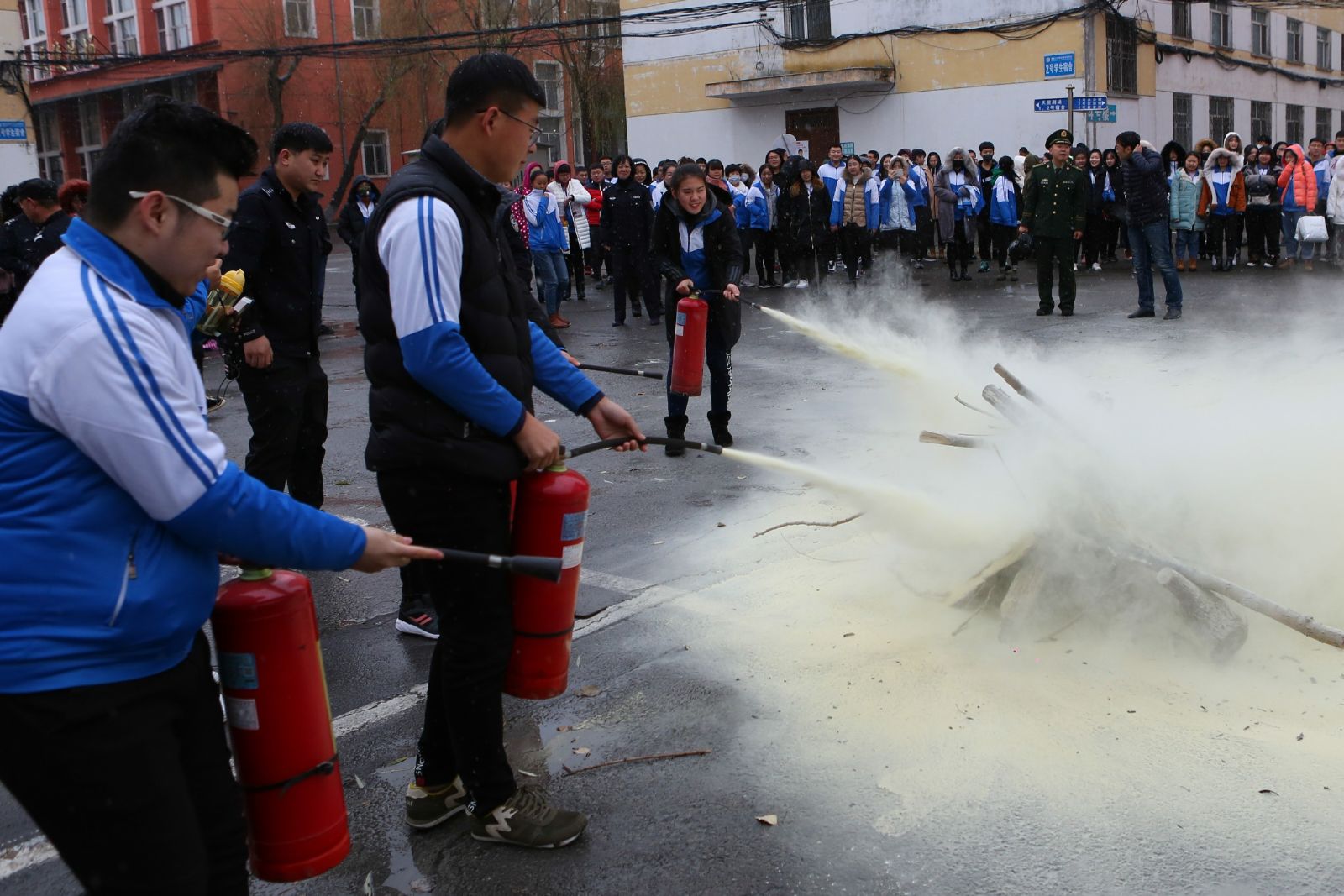 学生正在进行灭火演习