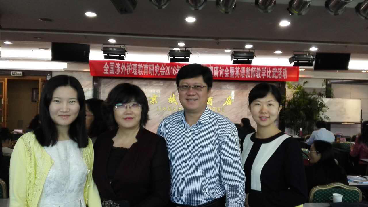 全国涉外护理教育研究会2016年度教学与管理研讨会暨英语教师教学比武活动于9月18日至21日在承德举行。我校由孙琳副校长带队,涉外护理系孙洪波主任、教师徐赫一、赵刚蕾一行四人参加了会议。孙琳副校长在会上就我校涉外护理办学及学生留学就业、国内高端就业情况作了专题介绍,我校的先进办学理念,涉外护理教学经验以及毕业生大量国内外高端就业现状受到兄弟院校的一致好评。徐赫一老师参加的教师比武活动,在系部老教师的帮助下,充分准备、充容应对,以92分的好成绩获得了一等奖,充分展现了我校年轻的英语教师的教学水平、教学风采。