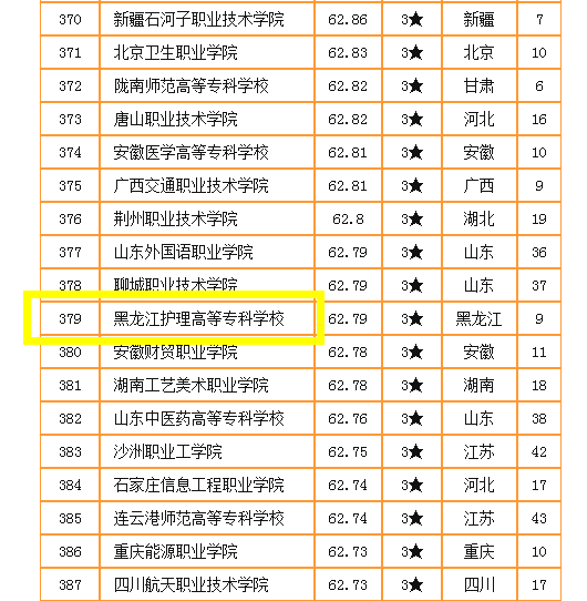 3月23日,中国高职高专院校竞争力排行榜正式发布。黑龙江护理高等专科学校获得3星评价,并以62.79的总分在全国排名第379位(高职高专1386所),在我省同类院校中排名第9。