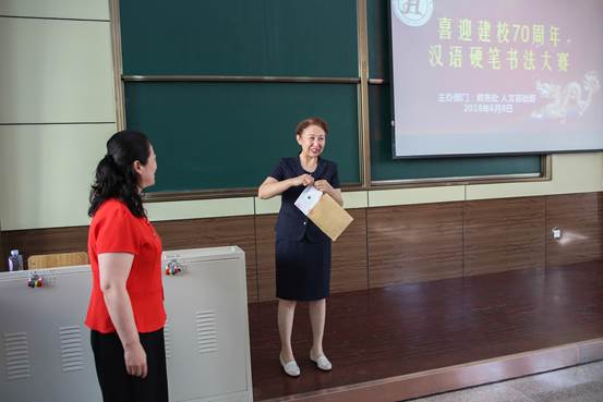 笑中含泪的演讲比赛结束之后,接着进行了喜迎建校七十周年汉语硬笔书法大赛,由彭波副校长现场开封大赛书写内容,从各系部选拔出来的选手倾情书写,一展才华。