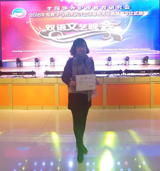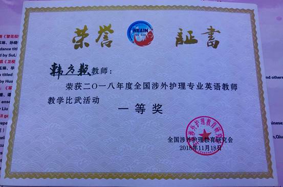 在刚刚落幕的“2018年度全国涉外护理专业英语教师教学比武活动”中,涉外第二教研室的韩方颖老师代表我校参赛,喜获“一等奖”的好成绩!备赛期间,系部高度重视,多次组织集体教研,涉外二组负责人赵锐老师更是反复组织组内教师从整体设计、课件制作、视频录制和教师展示全方位给予韩方颖老师积极地意见和建议。两个多月来,韩方颖老师在完成教学工作的同时,积极备战、刻苦演练。11月17日大赛当天,全国共有35所高职院校参会,22所学校参赛,可谓人才济济。经过六个小时紧张激烈地角逐,韩方颖老师不负众望,技压群芳,最终荣获一等奖的好成绩,为我校争得了荣誉!