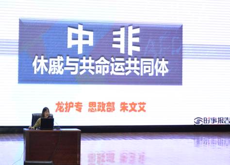 主讲人思政部副主任朱文艾老师从三个维度,即“中非交往的前世、今生与未来,”深入浅出地为学生们讲述了中非交往的历史进程和中非交往对世界重要意义。通过大量实例说明永续友好才是中非这对患难兄弟间的真诚期盼。
