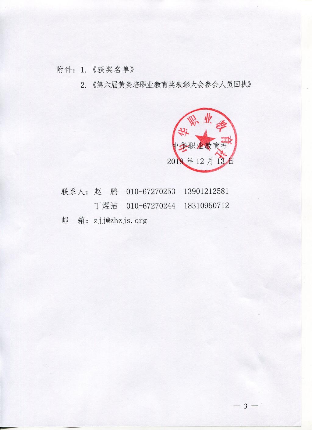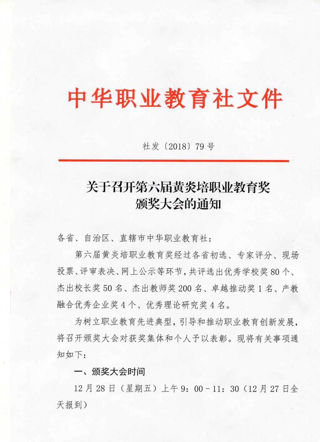 2018年12月13日,中华职业教育社发布了《关于召开第六届黄炎培职业教育奖颁奖大会的通知》(社发〔2018〕79号)文件,经过初选、专家评分、现场投票、评审表决、网上公示等环节,全国共评选出优秀学校奖80个、杰出校长奖50名、杰出教师奖200名、卓越推动奖1名、产教融合优秀企业奖4个、优秀理论研究奖4名。