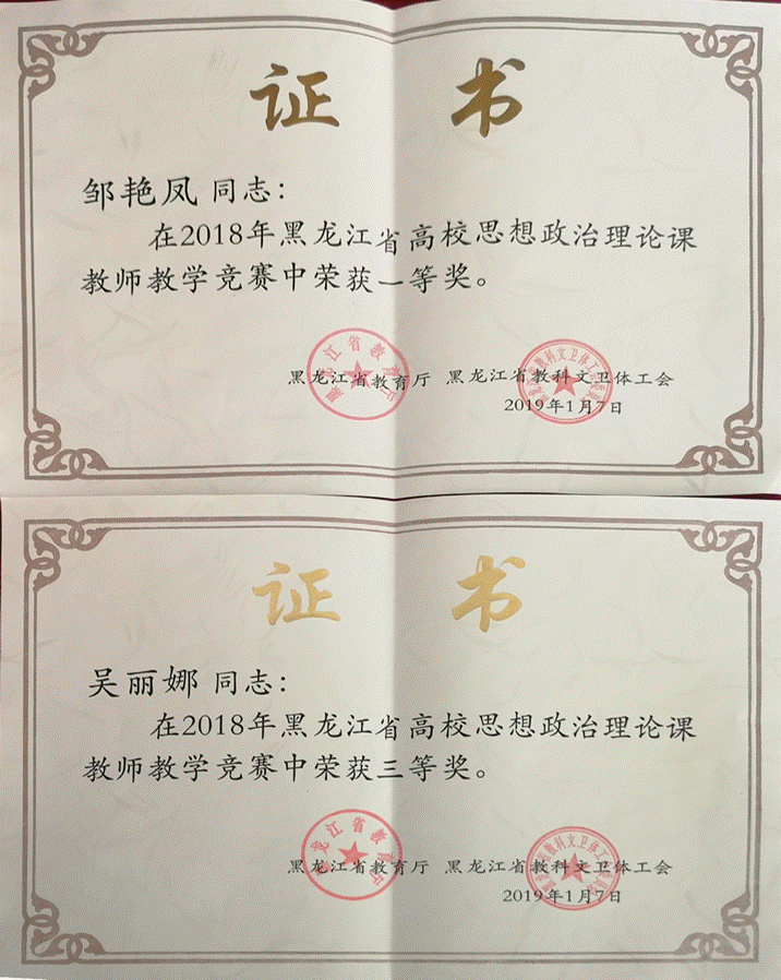 今天上午黑龙江省高校思政课教育教学系列活动总结表彰大会在友谊宫隆重举行,我校思政部邹艳凤、吴丽娜老师分别荣获2018年黑龙江省高校思想政治理论课教师教学竞赛一等奖和三等奖。祝贺两位老师!