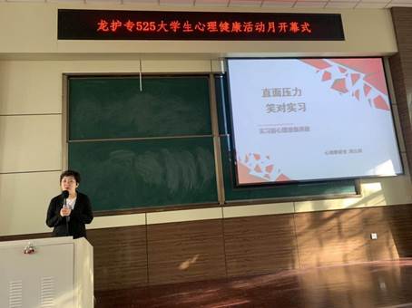 5月23日晚17:00,在南岗校区学术报告厅召开“525”大学生心理健康活动月启动仪式。学生们通过舞蹈、手语、宣誓和签名许愿仪式,展现了龙护专学子风采,同时也宣传了“爱自己更健康”的心理健康理念。活动的最后心理教研室周立超老师以“直面压力,笑对实习”为主题,为17级即将走上实习岗位的学生进行心理讲座。