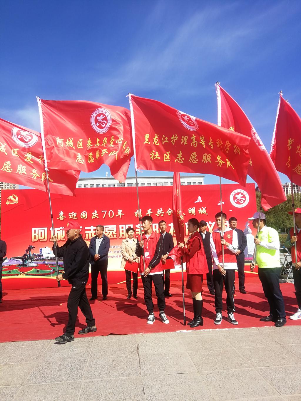 9月20日上午10:00,在哈尔滨市阿城区上京广场举行阿城区“喜迎建国70年”志愿者队授旗仪式。阿城区主要领导和各志愿者队代表出席活动。