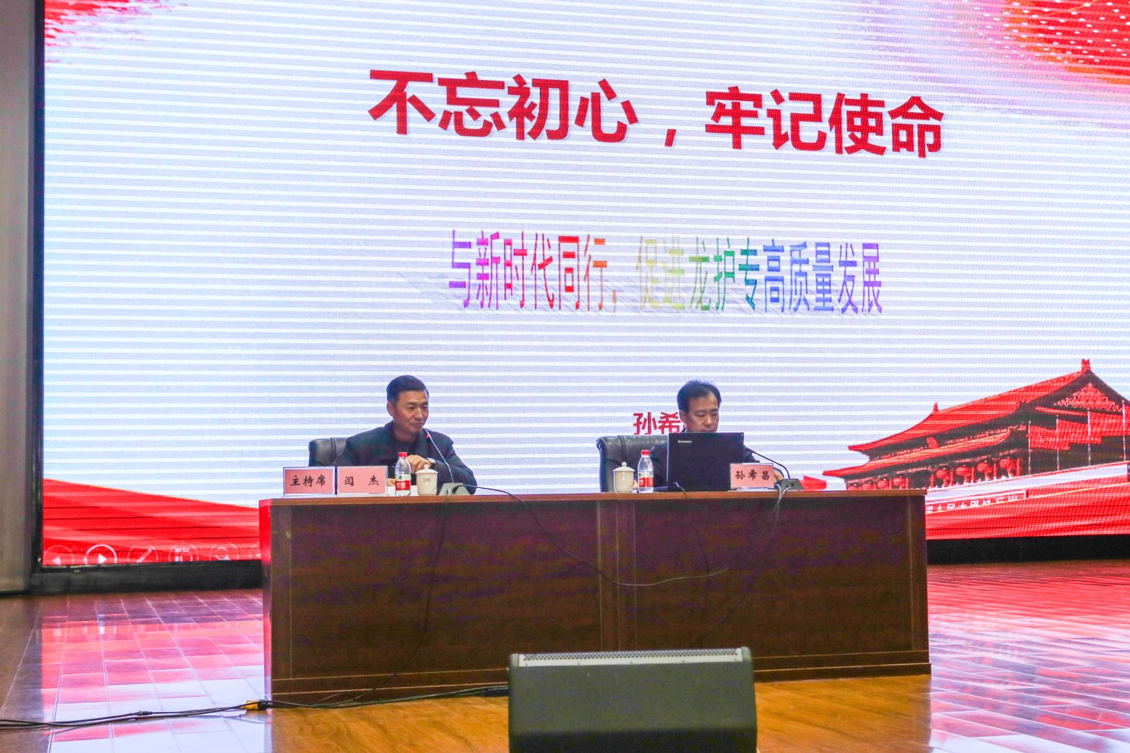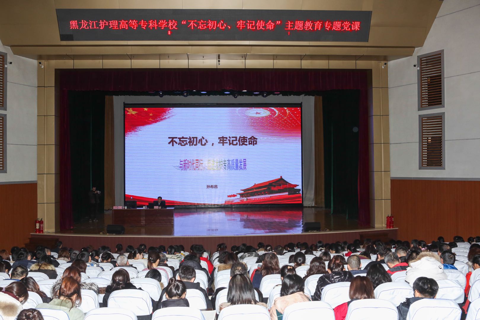 按照学校“不忘初心、牢记使命”主题教育的安排部署,结合主题教育学习调研情况,11月26日下午,校党委书记孙希昌在学校天使剧场以“不忘初心、牢记使命,与新时代同行,促进龙护专高质量发展”为题讲专题党课。学校全体教职工,江北校区中层以上干部参会。