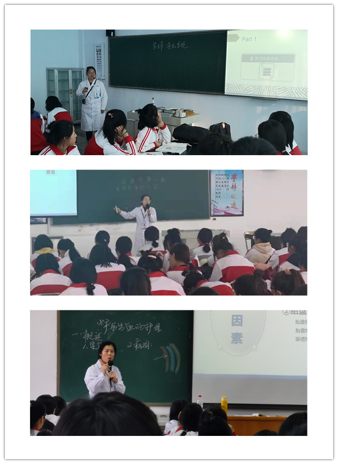 临床医学系李焱老师的理论课采取小组学习的形式,将竞争机制引入课堂,培养学生的集体荣誉感,课堂上设计的问题经过辨析后逐一解决,重点突出,教学内容过渡自然流畅,阶段小结以板书的形式呈现,课程思政切入点好。体育部刘沛老师的课设计新颖,利用翻转课堂提前布置预习,课堂上分组检测,学生自己选取适合的音乐进行比赛,充分调动学生的积极性,在游戏环节中充分体现团结、拼搏和积极向上的体育精神。思政部汪辰欣老师通过香港市民高唱国歌的视频导入课程,不仅让同学们认识到这节课讲的是香港局势问题,同时也展现出当前香港的主流民意就是止暴治乱,爱国爱港。在讲授过程中及时有效的进行价值引领和对比分析,注重发挥思政课引领社会思潮、维护意识形态安全的作用。医学基础部广慧老师熟练运用学习通软件实现师生互动。课前在学习通上发布学习资源供学生自学,课上通过自制的短视频,激发学生学习兴趣,通过三个任务的引领,凝练知识点,达成学习目标。临床医学系杜健老师运用实物教学的方式,课前准备好推荐摄入量的盐、油、糖、酒以增加学生的直观认识,加工处理教材,丰富教学内容,将书本知识与生活实际紧密结合,充分运用云班课等手段,及时反馈、巩固学习效果。人文基础部陈婉宁老师利用蓝墨云班课了解学生们的情绪困扰,观看70周年国庆阅兵和香港暴力事件的视频,引出情绪的概念,然后针对学生们的情绪困扰讲解情绪调节策略。药学系宋璞原老师采用表格法、对比法、填空法、思维导图等多种方式,将云班课、视频、动画等现代方法的使用与脉络清晰、设计合理的传统板书有机结合、优势互补。重、难点突出,总结及时,结合云班课任务互动讨论,帮助学生梳理知识,加深学生对中药材的药理药效及临床应用的理解记忆,课程思政渗透自然、有高度。护理系李会明老师联系临床实例,通过生动形象的比喻帮助学生理解,通过联系已有知识和大范围的提问促进知识的融会贯通、加深印象,使理论与临床实践相融合,提升学生的临床思维能力。