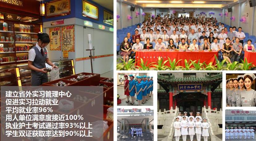 学校长期与北京清华长庚医院、北京航空总医院、哈尔滨医科大学附属第一、二医院等20余所国内知名医院以及各省市疾控中心、社区卫生服务中心等开展实习合作。2019年毕业生就业率高达96%以上。