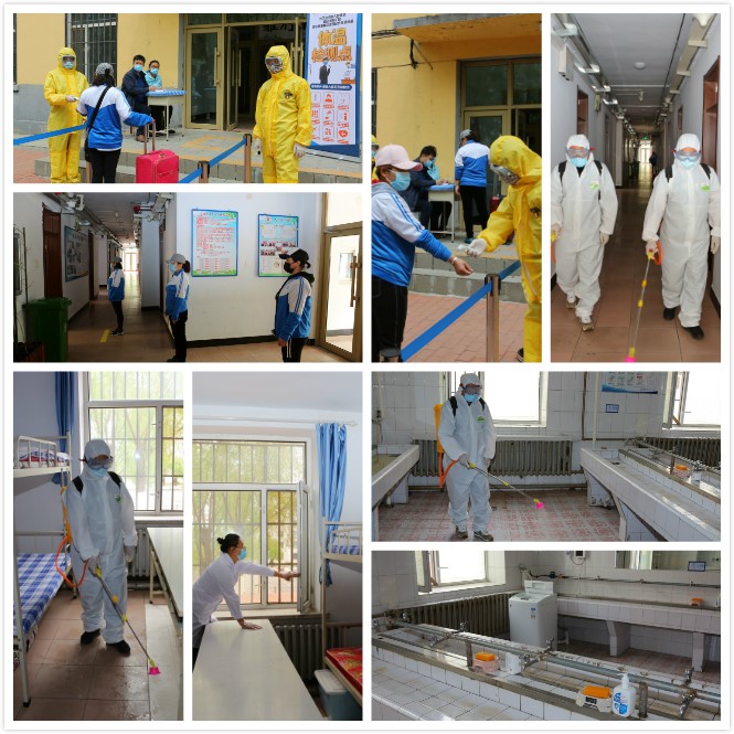 后勤部门安排专人定时对公寓房间、楼道、洗漱间、卫生间进行开窗通风和消毒杀菌工作。返校学生进入公寓按照间隔1.5米进行排队。由学生工作处舍务管理人员对进入公寓学生进行体温测量,体温正常方可入寝,并进行手消毒和信息登记。按照寝室划定路线进入寝室,遵守单向通行、右侧通行、间隔1.5米原则。