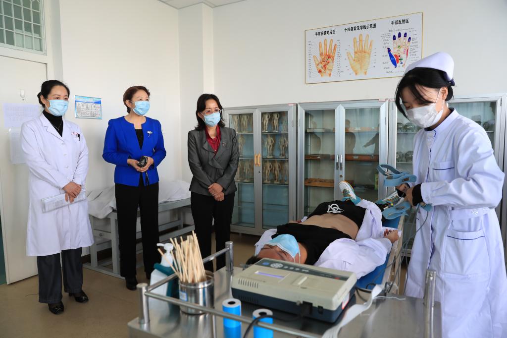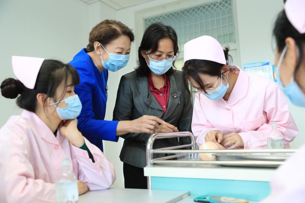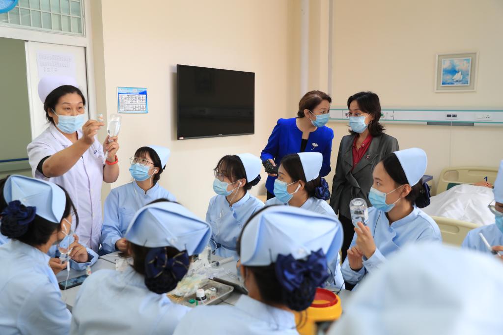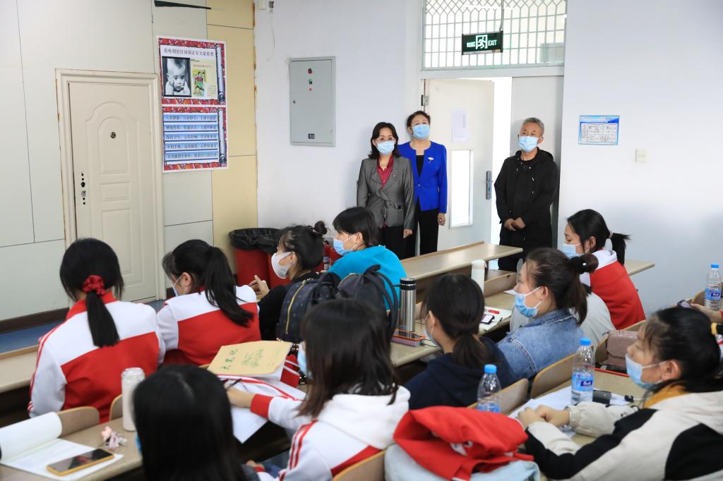 在护理实训楼,张校长一行逐层走访了经络腧穴与推拿治疗实训室、急救护理室、中医护理室、理实一体化示教室、阶梯教室等地,对教师到岗、学生出勤、师生课堂状态等进行了全面和细致的了解。课堂上,教师授课扎实严谨,学生听课认真积极,师生互动密切,展示了我校师生良好的精神面貌和严谨踏实的教风学风。张校长强调,授课教师要在完成教学计划的基础上,重视临床教学中学生人文关怀意识的培养,推动“课程思政”与专业教育有机融合,做好线下和线上教学的衔接。
