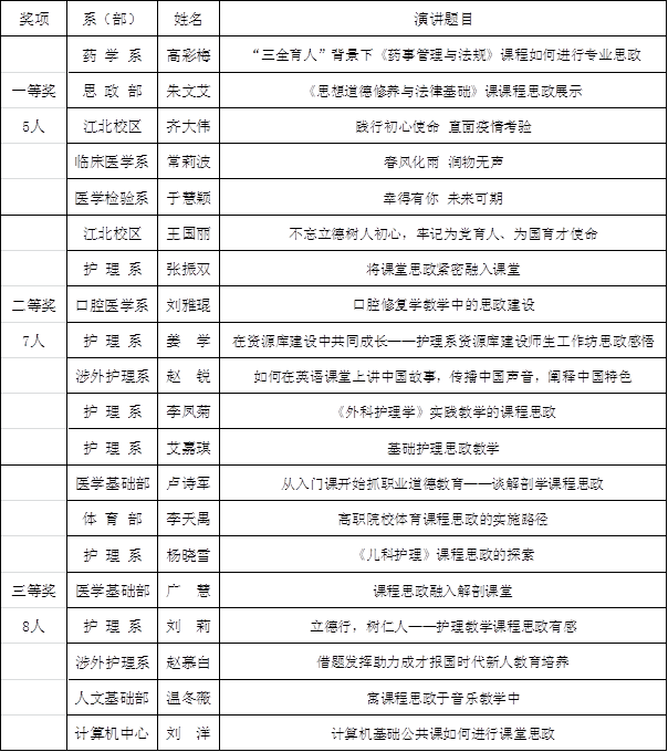 为深入学习贯彻习近平总书记在全国高校思想政治工作会议上的讲话精神,促进我校教师更新教育理念,实施课程思政,同时为了欢庆第36个教师节。2020年9月,黑龙江护理高等专科学校开展“课程思政系列活动”之教师演讲比赛。因疫情原因,为避免聚集,本次演讲比赛采取上交演讲视频形式,全校20名教师报名参赛,由督导办公室组织专家进行评审,共评出一等奖5人,二等奖7人,三等奖8人。