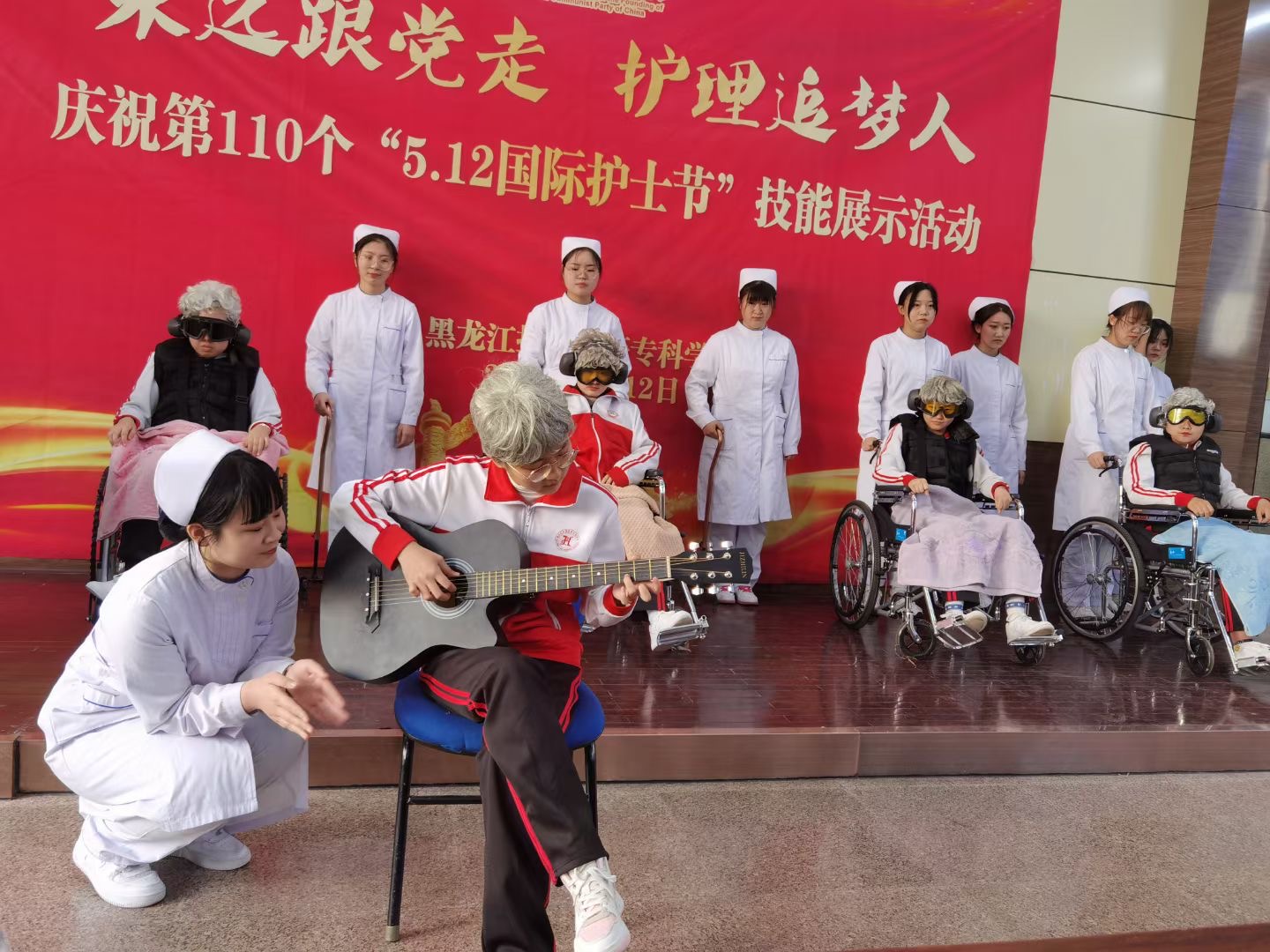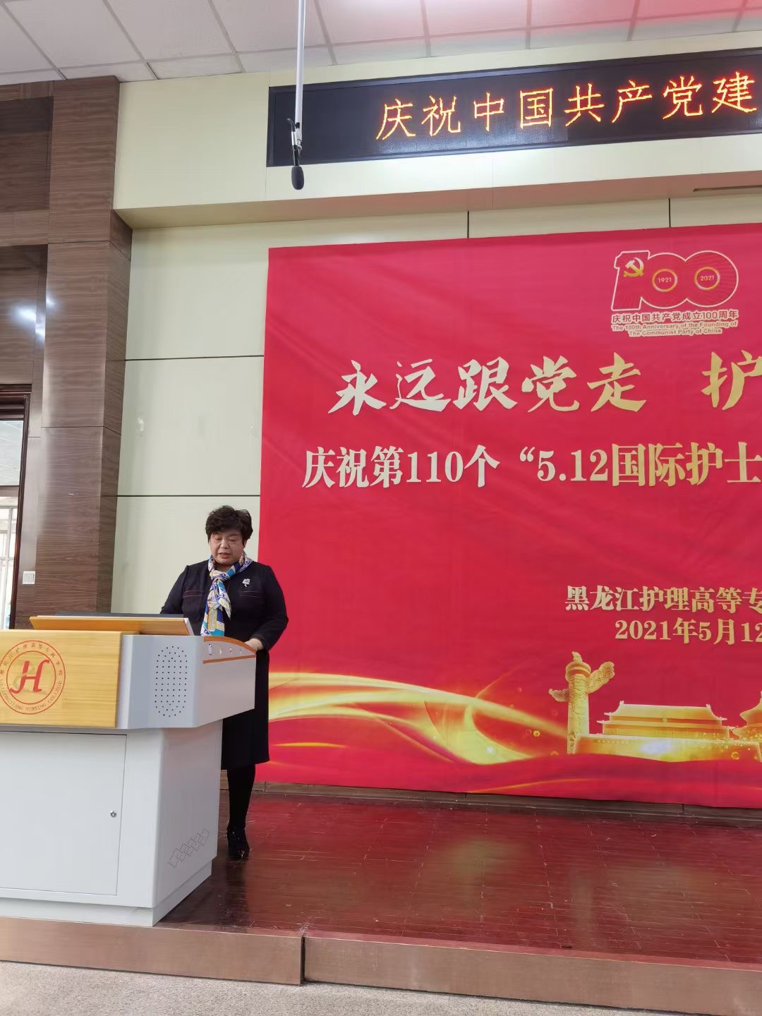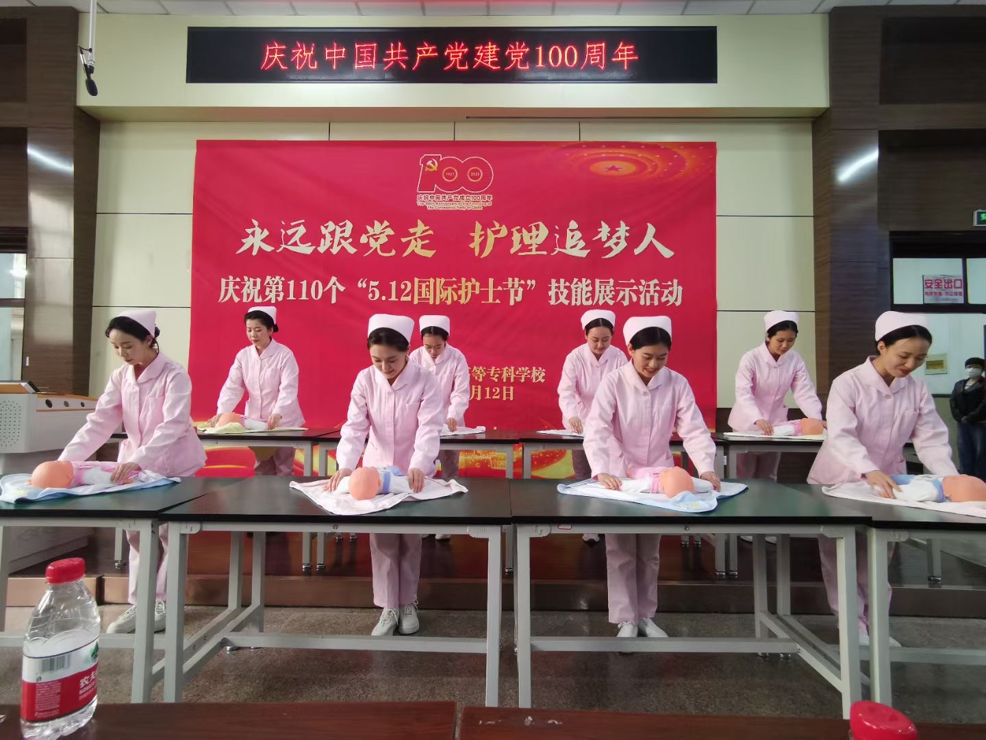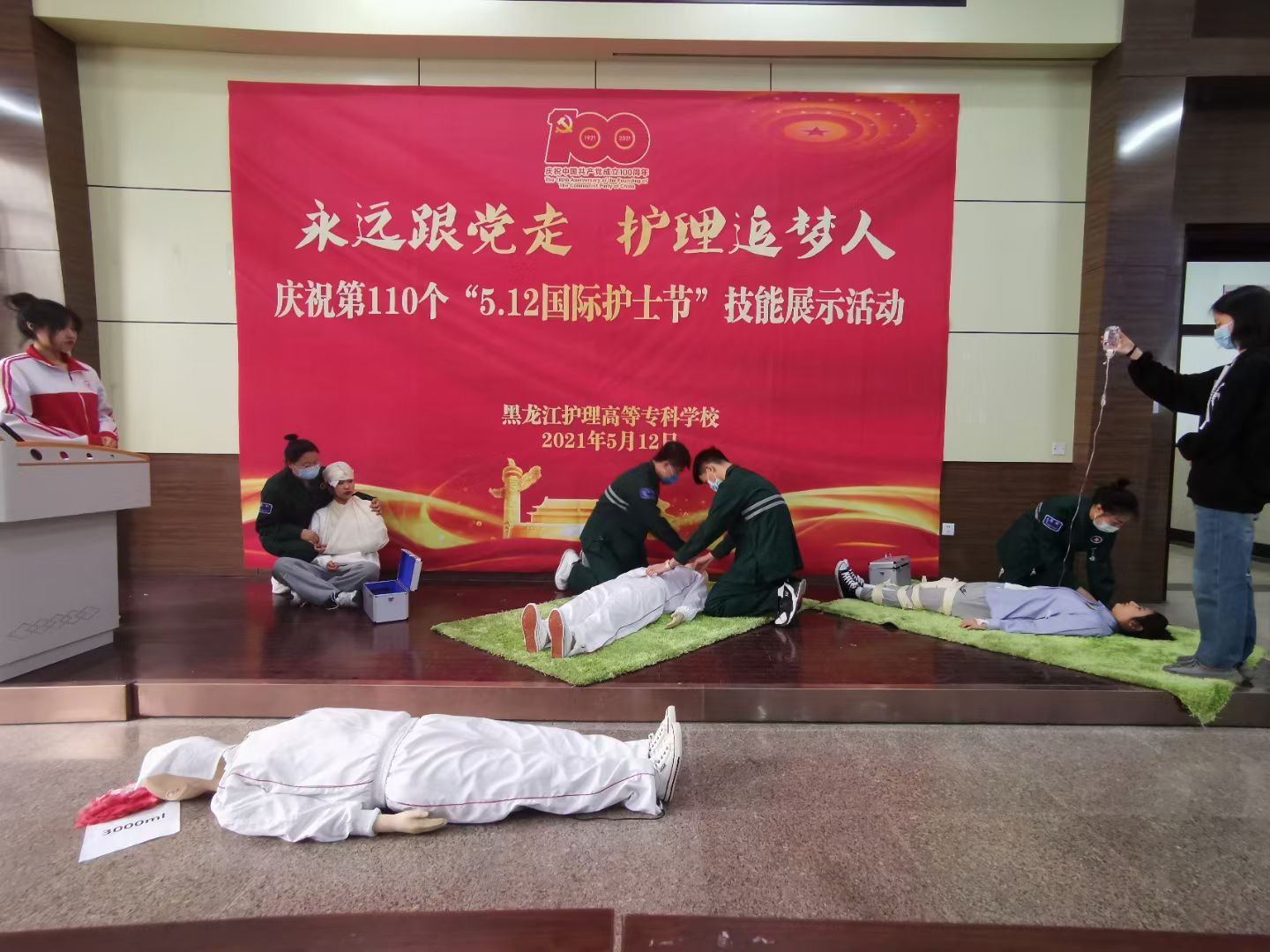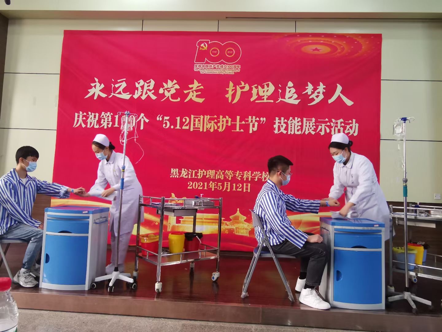 5月11日下午在南岗校区举办了“庆祝建党100周年暨5.12国际护士节”技能展示活动,活动由教务处牵头,护理系、临床医学系、涉外护理系、口腔医学系联办,学校教学校长林杰、督导办公室主任廖林楠、教务处刘瑾科长、图书馆馆长徐艳华、临床医学系主任黄新宇、护理系书记姜哲、口腔医学系书记刘鹤颖、外事办公室副主任李博宇等领导参加了此次活动,活动由护理系副主任陈昭君主持,特别邀请到临床专家、哈医大一院护理培训中心主任张亚仙做技能展示的点评嘉宾。来自全省12所高职院校47名骨干教师以及各系部教师、学生代表观摩了此次活动。技能展示共分为六个项目:护理系老年保健与管理专业技能展示《夕阳红--老年照护》、口腔医学系技能展示《硅橡胶初印膜制取》、护理系临床护理技能展示《静脉输液技术》、临床医学系助产专业技能展示《婴儿被动操》、涉外护理系技能展示《血压测量》、护理系急救护理技能展示《灾难现场救护》,在短时期的准备下,同学们娴熟的技能操作,亲切的话语,扎实的基本功,充分展示了我校学生的专业素养,展示结束后张亚仙主任从临床岗位标准对技能进行了精彩点评,为龙护专今后的教学提出了宝贵建议。