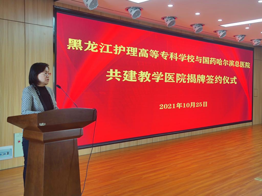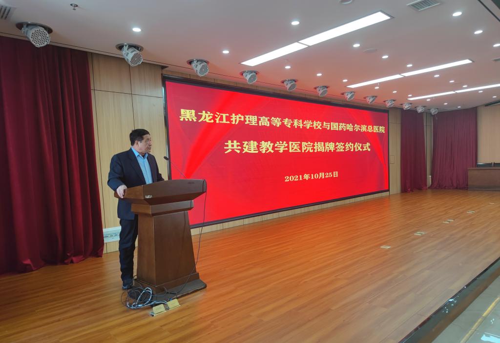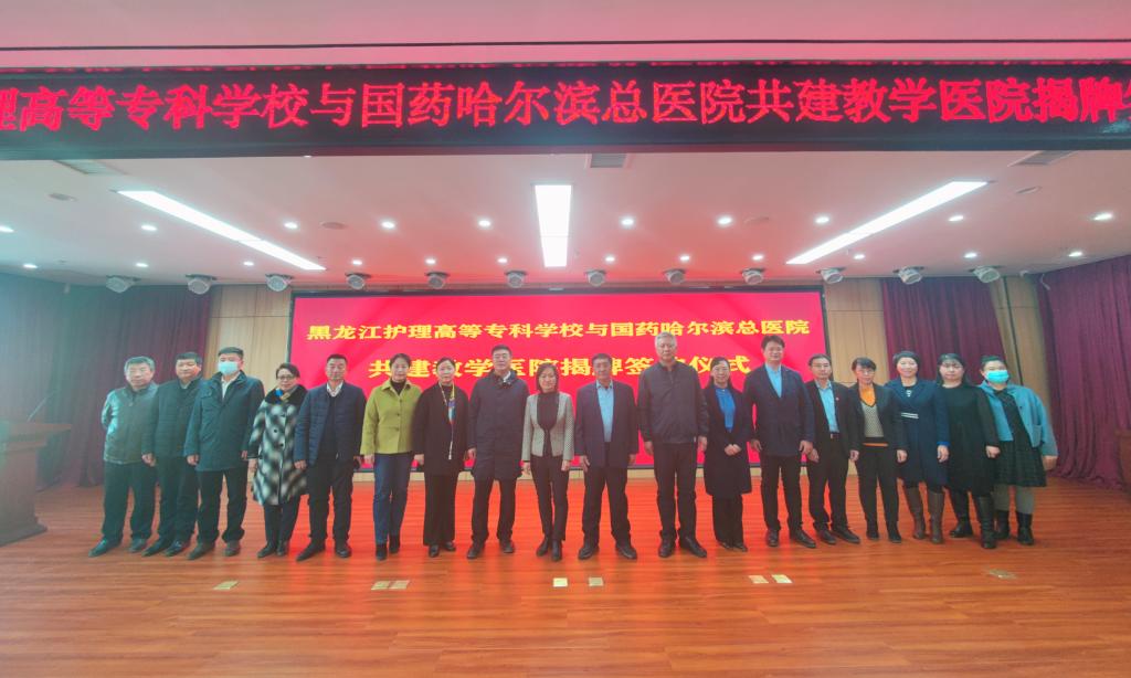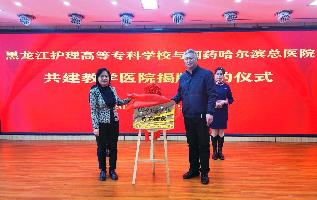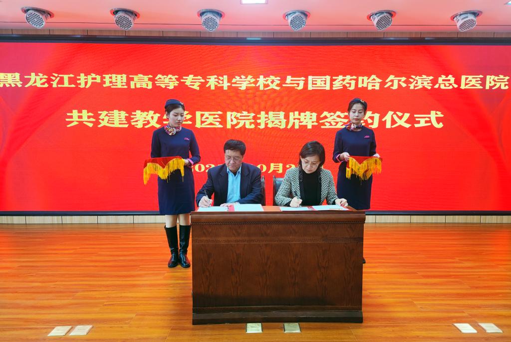 随后,双方进行黑龙江护理高等专科学校与国药哈尔滨总医院共建教学医院签约揭牌仪式。