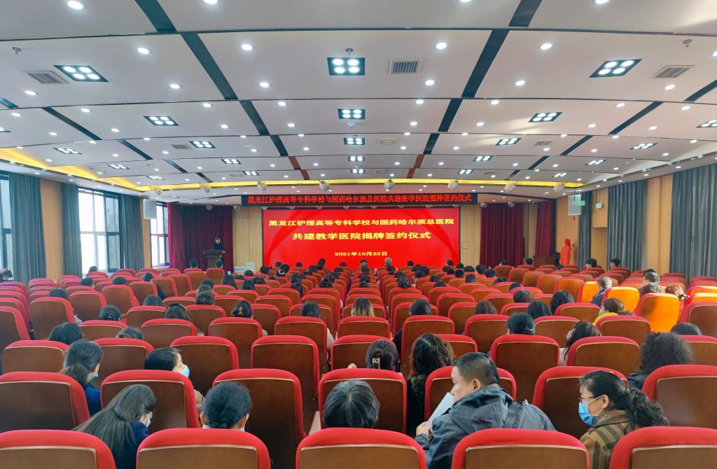 2021年10月25日,黑龙江护理高等专科学校教学医院签约揭牌仪式在国药哈尔滨总医院举行,国药哈尔滨总医院正式成为我校教学医院。我校校长张晓杰、副校长夏广军、林杰、教务处长施泓、校企合作办主任李岩、临床医学系主任黄新宇、临床医学系书记宁为群、学工处长程合坤,国药哈电(哈尔滨)医院管理有限公司总经理、国药哈尔滨总医院院长李澎伟、国药哈电(哈尔滨)医院管理有限公司党总支书记王利光、副总经理王淼、财务总监林张军、副院长王立军、安子森、许宏莹、赵曦虹、郭秀华出席仪式。签约揭牌仪式由国药哈尔滨总医院副院长尹艳艳主持。