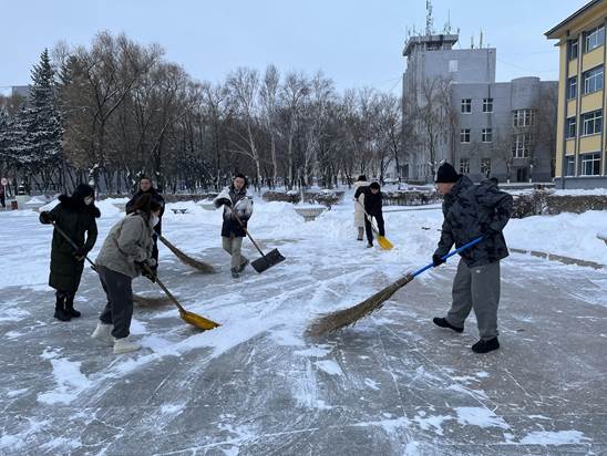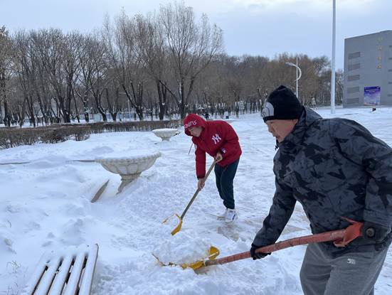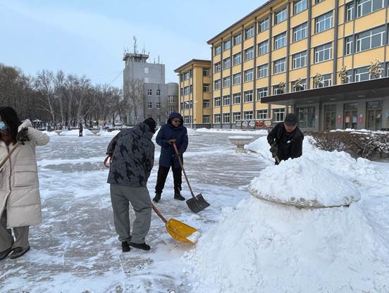 为了不让师生滑倒受到伤害,为了减轻物业人员的清雪工作压力, 11月23日清晨,天刚蒙蒙亮,日夜坚守在阿城校区工作岗位上的后勤第一党支部、护理系党支部、药学系党支部的党员干部,在支部书记的带领下,不分男女老少,抡起各种清雪工具齐上阵,不畏严寒,干劲十足,热火朝天。汗水湿透了衣衫,他们全然不顾,冰雪打湿了鞋袜,他们依旧坚持,刺骨的寒风吹红了脸、冻僵了手,他们已然不知......