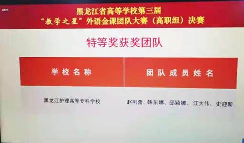 在12月1日举办的黑龙江省高校第三届“教学之星”外语金课团队大赛(高职组)决赛中,由我校涉外护理系教师赵刚蕾作负责人的英语教师团队力拔头筹,摘得决赛冠军,喜获“特等奖”荣誉。团队由赵刚蕾负责教学设计,韩东娜负责教学展示,邸颖娜负责录课,江大伟负责决策建议,史迎新负责统筹规划。