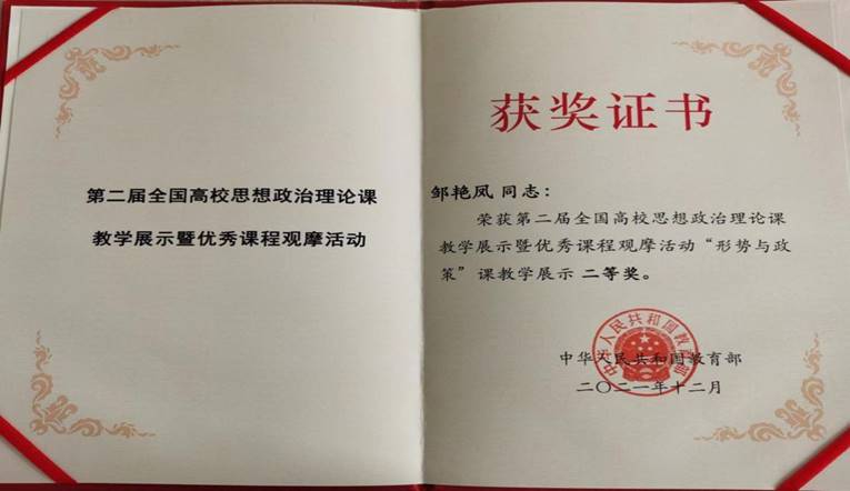2021年12月,教育部办公厅公布了第二届全国高校思想政治理论课教学展示暨优秀课程观摩活动评选结果,全国共275名教师获奖。其中,黑龙江省15名教师获奖,我校思政部青年教师邹艳凤荣获“形势与政策”课教学展示二等奖。