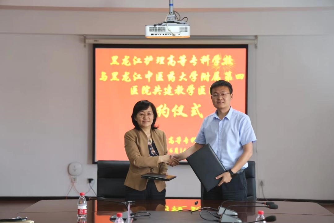 2022年6月14日,黑龙江护理高等专科学校与黑龙江中医药大学附属第四医院共建教学医院签约仪式在我校举行,至此黑龙江中医药大学附属第四医院正式成为我校教学医院。黑龙江中医药大学附属第四医院院长刘贵军、副院长王德生、教务科长金京星、办公室主任肖瑶,我校校长张晓杰、副校长林杰、教务处长施泓、校企合作办主任李岩、临床医学系主任黄新宇、就业办主任宋秀范出席签约仪式。