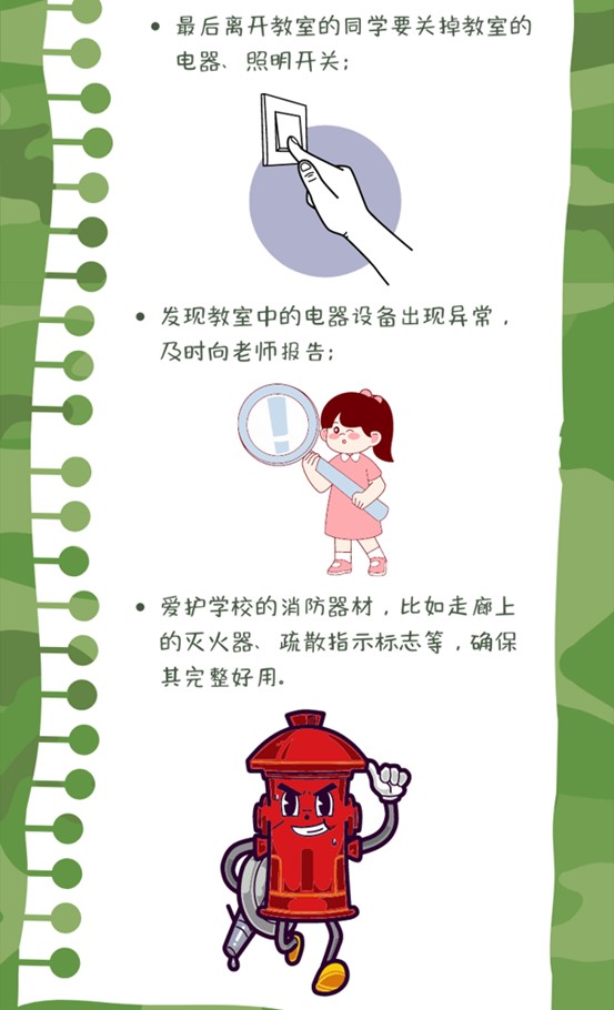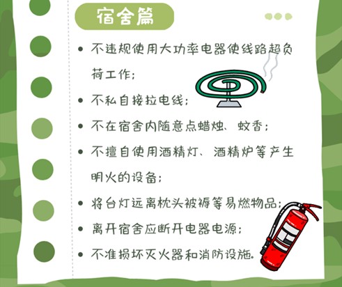 4、遵守寄宿规定,不乱拉电线、不用明火,保持寝室干净通风,熟知逃生通道,会用消防器材。