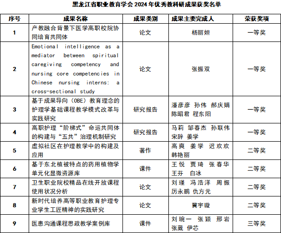 在2024年底申报的黑龙江省职业教育优秀教科研成果评选活动中,我校共荣获9项优秀教科研成果,其中一等奖4项,充分体现了我校教师在职业教育教学、课程改革、师资队伍建设及教学技术创新等方面的深入探索和有效成果,为全省职业教育的高质量发展提供了有益的参考和借鉴。
