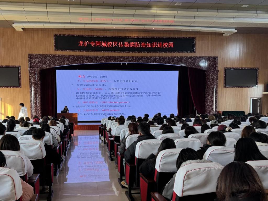 在阿城校区,刘洪影所长围绕水痘、腮腺炎、结核病等呼吸道传染病,系统讲解其流行特征、识别方法与防控原则,强调“四早”处置及疫苗接种,并就校园消杀等环节提供实用指导,助力学校构建全链条防控体系。安艳春所长聚焦艾滋病防治,结合案例阐明传播途径与预防要点,解析“ABC”原则与国家“四免一关怀”政策,引导师生科学防护、消除歧视。