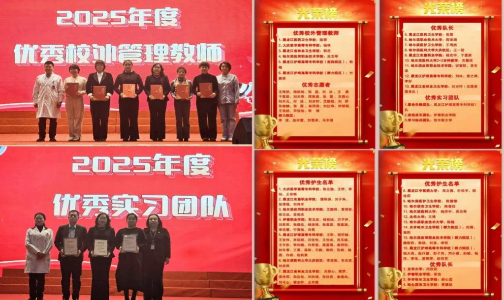 11月26日下午,哈尔滨医科大学附属第一医院召开实习表彰大会。我校护理实习团队凭借卓越的人才培养质量与深度院校协同成效,获得“优秀实习团队”殊荣;教师韩梅、付赛男以专业的管理素养与暖心的指导服务,获评“校外优秀管理教师”;实习学子们则凭借扎实的专业功底、规范的操作技能与温润的人文关怀,成功斩获“优秀实习生”“优秀实习队长”“优秀志愿者”等多项荣誉,全方位展现了龙护专精益求精的育人成效。