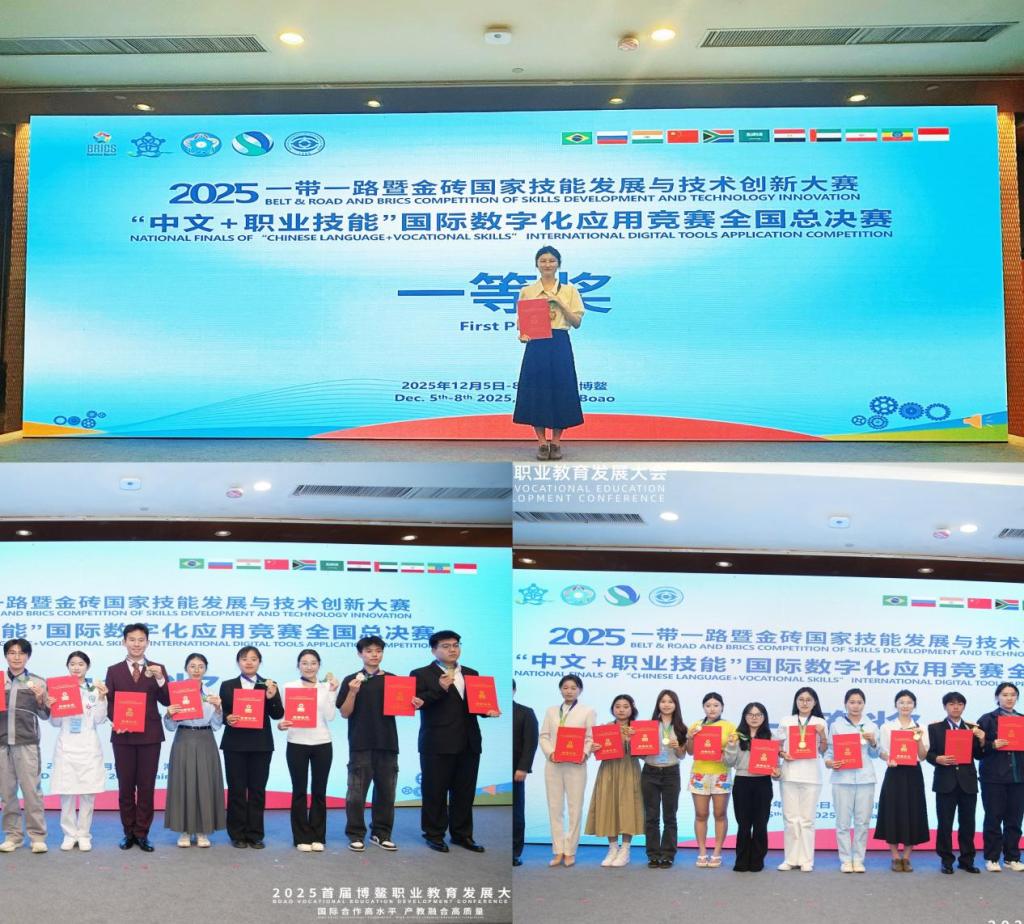 12月9日,2025一带一路暨金砖国家技能发展与技术创新大赛之“中文+职业技能”国际数字化应用竞赛全国总决赛在海南博鳌亚洲论坛国际会议中心圆满落幕。我校基础教育部王娜、晁亮两位指导教师在周佳主任的大力支持下,带领护理系、药学系共五名学生组成的参赛团队表现卓越,取得一等奖(金牌)1项、二等奖(银牌)2项、三等奖(铜牌)2项的优异成绩。同时,我校因组织与支持工作出色,被赛事组委会授予 “最佳组织奖” ,充分彰显了我校在国际化高水平技术技能人才培养方面的综合实力与突出成效。