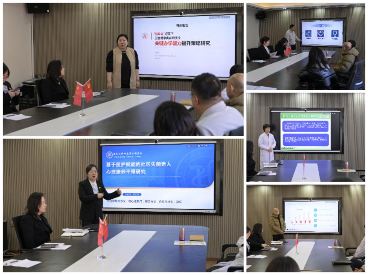 开题会上,5位课题主持人依次进行开题汇报:周振老师聚焦生物医药前沿,带来《银/铂复合纳米制剂的可控构建及其诱导抗黑色素瘤长效免疫治疗的研究》,为恶性肿瘤治疗提供创新思路;杨佳老师的《质谱解析内生菌对刺五加次生代谢产物的影响和调控机制的研究》,对发掘药用植物价值意义深远;林博文老师的《恩格列净在2型糖尿病小鼠模型中的肾保护及改善认知功能障碍的作用》,紧扣临床需求,为糖尿病并发症防治开辟新方向;周立超老师聚焦社会民生,汇报《基于医护赋能的社区失能老人心理康养干预研究》,为完善养老服务体系提供有力支撑;汪颖老师立足教育改革,围绕《“新双高”背景下卫生健康类高职院校关键办学能力提升策略研究》展开深度剖析,为学校高质量发展指明路径。