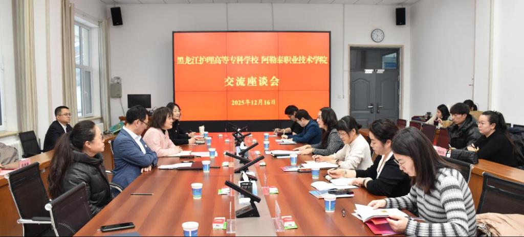12月15日黑龙江护理高等专科学校与阿勒泰职业技术学院在智慧大楼会议室举行援疆交流座谈会。双方围绕“寒地医疗”与“职教援疆”两大主题,座谈研讨深化职业教育协作,共谋高质量发展新路径,共绘一幅跨越地域的卫生健康职教新蓝图。