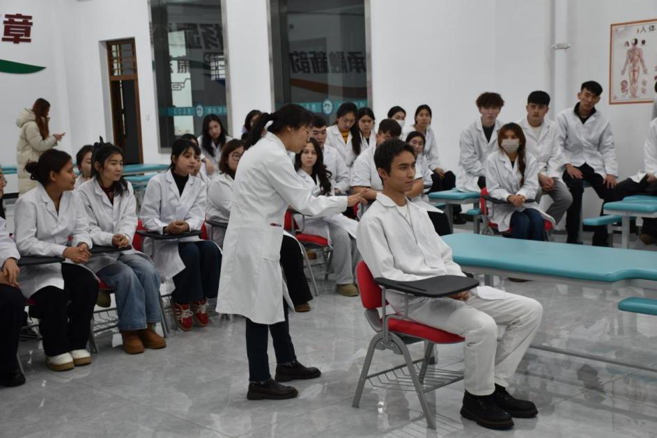 “简、验、廉、便”是中医的特色,也是康复医学系教师张艳艳《常用推拿手法》课的核心。张老师轻理论铺陈、重实战指导,强调“手随心转,法从手出”。通过手把手带教,她让原本觉得手法神秘的学生,在一堂课里就掌握了基本要领。这堂课张老师不仅传授了技能,更在边疆学子心中播下了中医文化的自信之种。