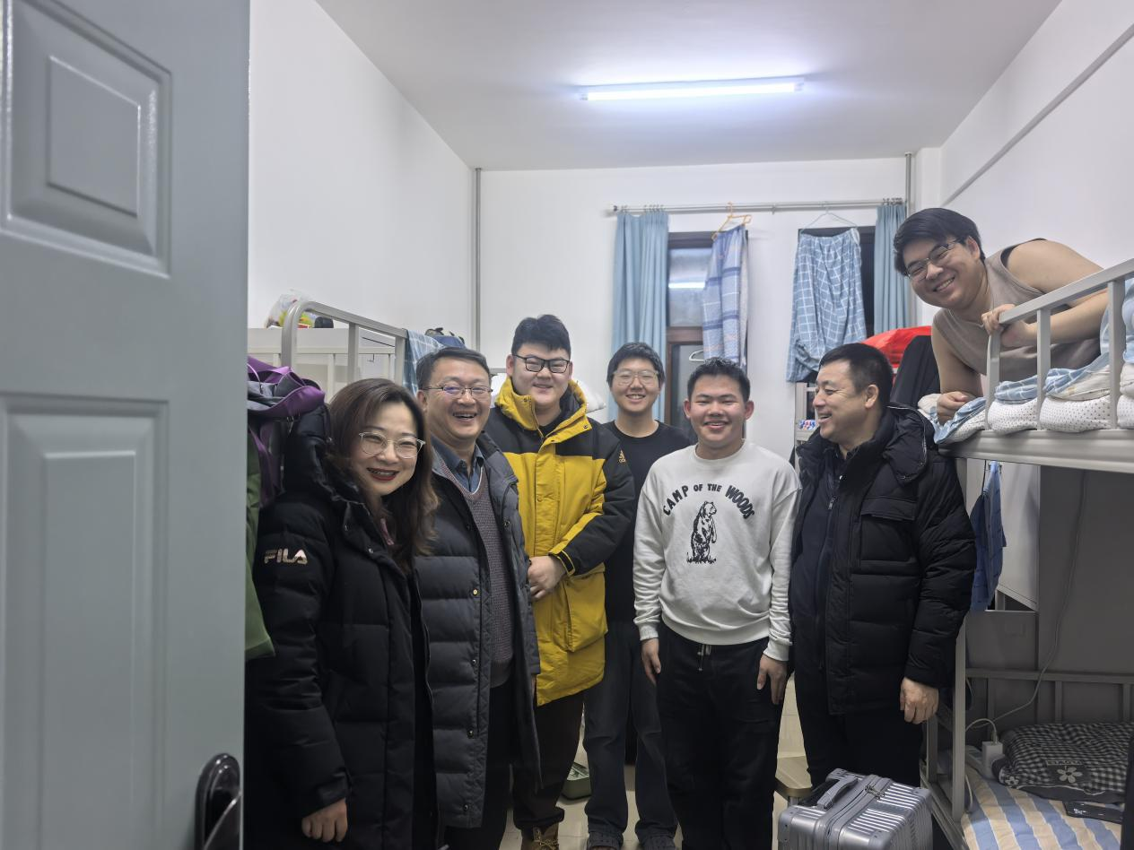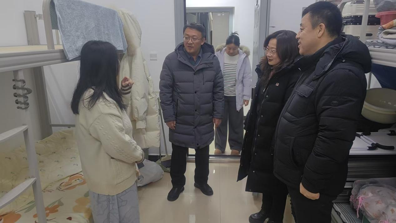 工作组一行率先深入学生公寓,以“行走的生活课堂”形式与同学们亲切交流,详细询问大家的学习进展、生活需求及假期返乡规划,认真倾听同学们对校区教学管理、服务保障等工作的意见建议。纪委书记于新宇着重叮嘱同学们务必强化安全防范意识,尤其做好返乡途中交通出行安全防护,妥善保管个人财物,主动向家人报备行程轨迹,确保平安顺利抵达家中。副校长于沛君鼓励同学们持续保持良好生活习惯,在离校前细致做好寝室卫生清扫与物品整理工作,以整洁有序的状态圆满结束本学期校园生活。