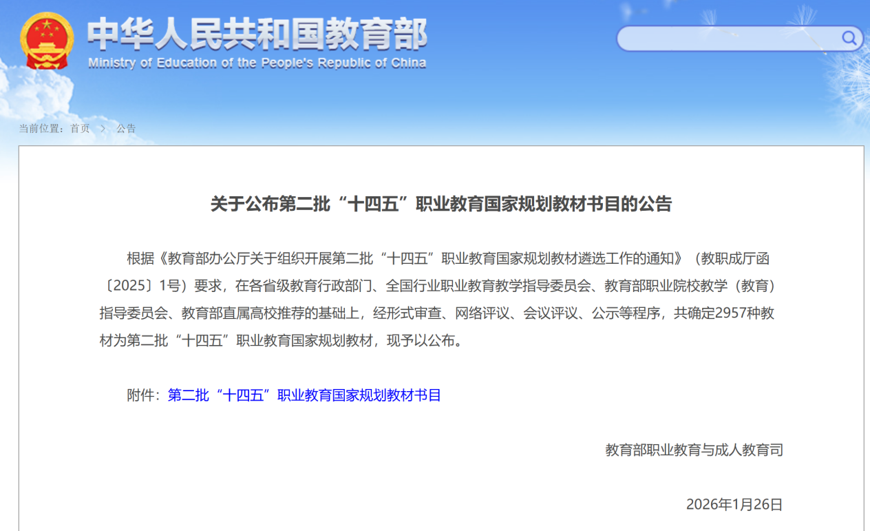 近年来,我校始终将“金教材”建设作为推进“五金”(金专、金课、金师、金地、金教材)建设的核心环节,作为落实职业教育提质培优行动计划的关键抓手,持续聚焦教材内涵建设,推动优质教学资源迭代升级。此次教材入选国家规划教材,是教育部对我校教学质量、教材建设水平及人才培养成效的高度认可,为学校“双高”建设再添浓墨重彩的一笔。