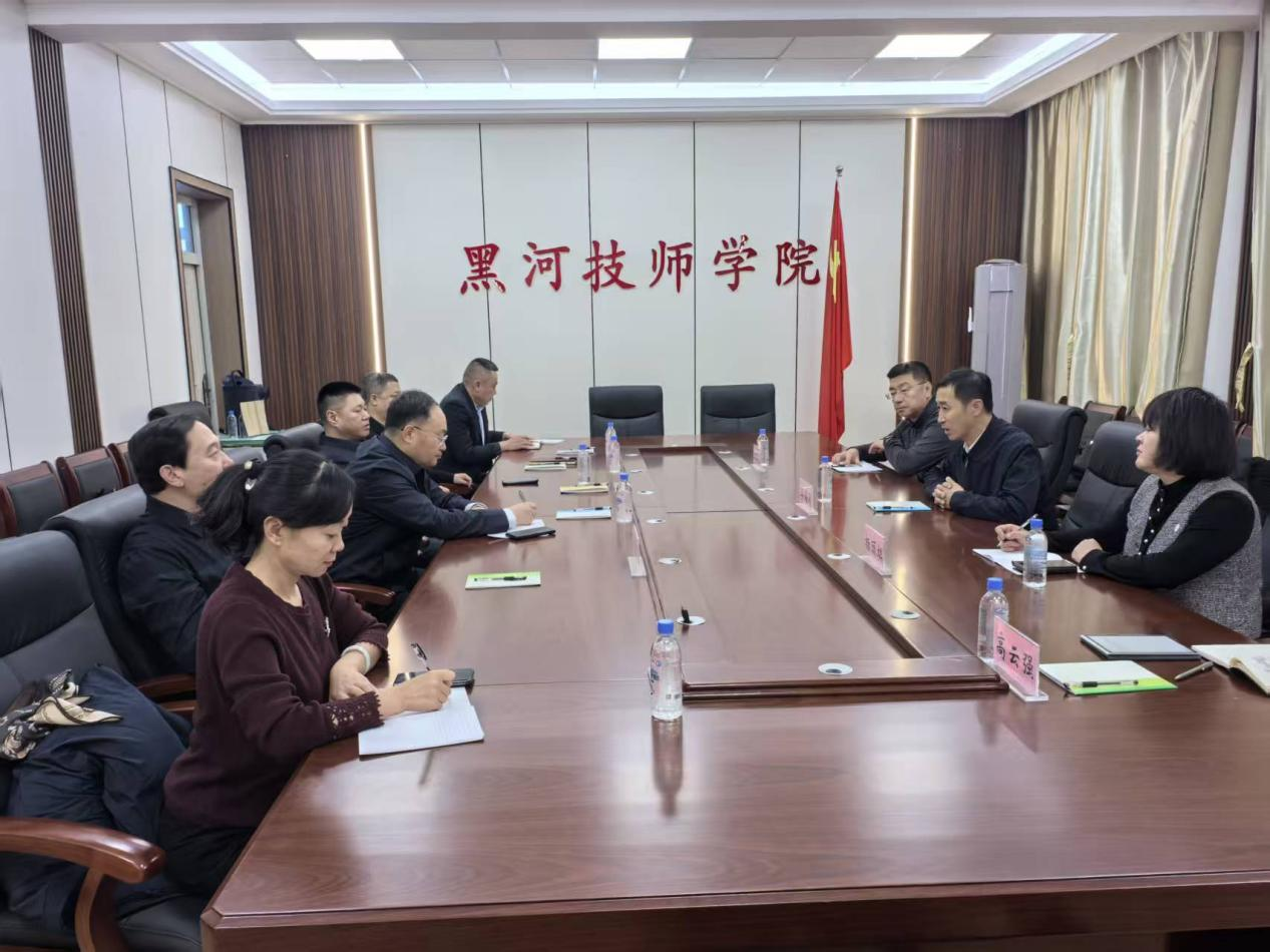 2月12日,学校党委书记李海涛,副校长杨丽妲、张荣兴一行前往黑河市,与黑河市委副书记、市长秦波,副市长王伟,市教体局局长孙雪梅,市人民政府督学王庆,黑河技师学院院长张战勇及其他院领导举行工作会议。双方就推进学校项目建设与长远发展等议题进行了深入交流,并在资金保障、基建规划、政策支持及国际合作等关键领域达成广泛共识。各方明确将以“市校院一体、协同攻坚”为原则,全面推动学校发展迈向新阶段。