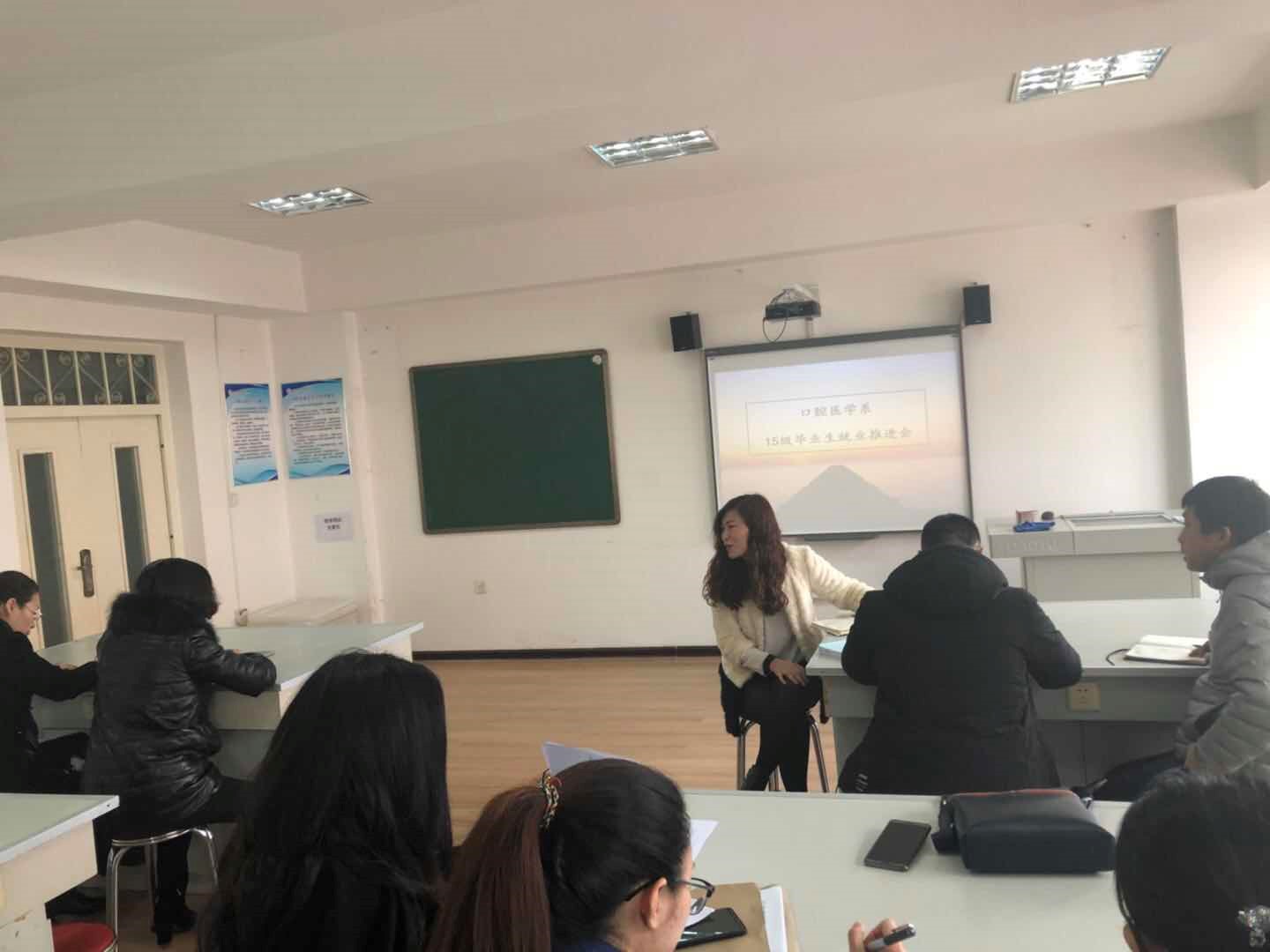 2018年3月23日,口腔医学系举办了2015级毕业生就业工作推进会,主管实习就业的孙琳副校长和就业办宋秀范科长出席了本次就业工作推进会,并指导工作。口腔医学系刘鹤颖书记带领全体辅导员进行了毕业生就业工作阶段性汇报,并对下一步的毕业生就业工作进行了部署和分工,孙琳副校长从如何学习掌握最新就业相关国家政策以及如何具体推进学生就业率等方面来对口腔医学系的毕业生就业工作进行指导。最后,全体学管人员共同学习了关于毕业生就业的最新相关文件。旨在准确把握就业政策,为学生进行更精准的就业指导。实现学生完全就业、高质量就业的目标。