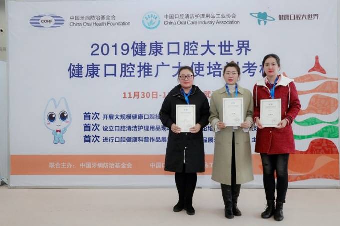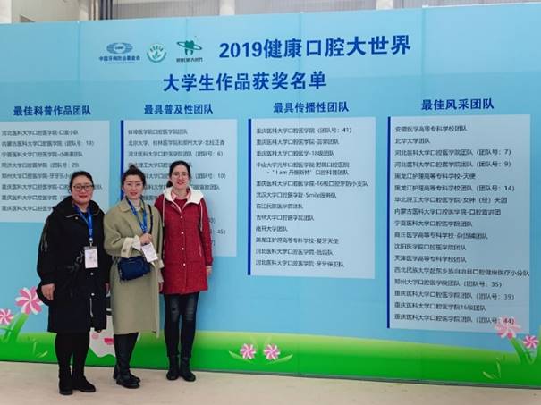 2019年11月30日-12月2日由中国牙病基金会主办的“2019健康口腔大世界 健康口腔推广大使培训考核”活动在武汉举行。活动内容包括六大板块:理论培训、技能考核、技能体验、产品展示、科普展播、主题交流。中国牙病基金会即将在全国创建100个健康口腔推广基地,1000名口腔健康推广大使。我校口腔医学系“爱牙天使小分队”派出了齐健、闫闯、夏德薇三位教师参与其中,他们不负众望顺利通过培训和考核,取得了“健康口腔推广大使”的称号。