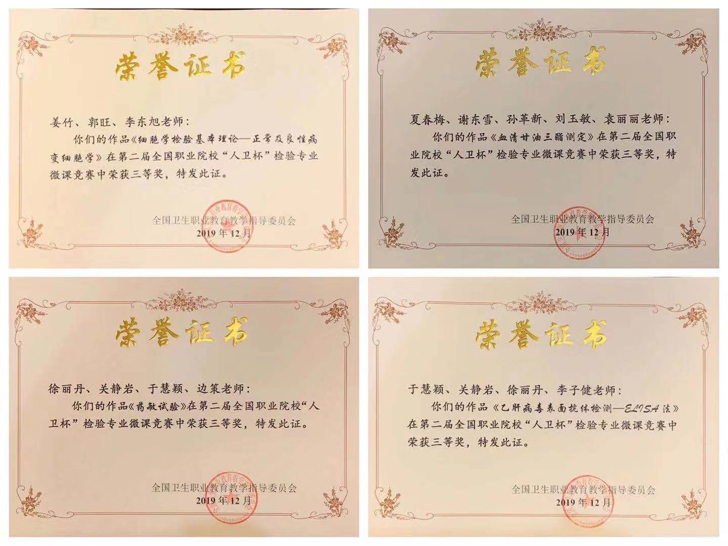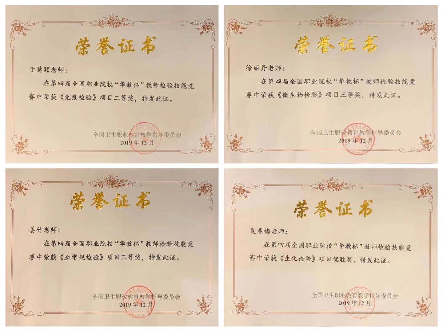 2019年12月5日—12月7日,第四届全国职业院校“华教杯”教师检验技能竞赛在河北邢台举行。比赛设立血常规检验、生化检验、免疫检验、微生物检验、形态学检验以及微课比赛六个项目。为了提高教师专业素养、更好的满足医学检验技术专业人才培养需求,我院由曹德明主任带队,四位教师组成的参赛队伍参加了此次竞赛,获得二等奖1个,三等奖2个,优胜奖1个。其中于慧颖获得免疫检验二等奖;徐丽丹、姜竹分别获得微生物检验三等奖、血常规检验三等奖;夏春梅获得生化检验优胜奖。4个微课作品参加微课大赛,分别获得三等奖。
