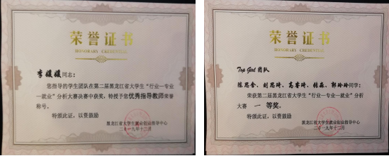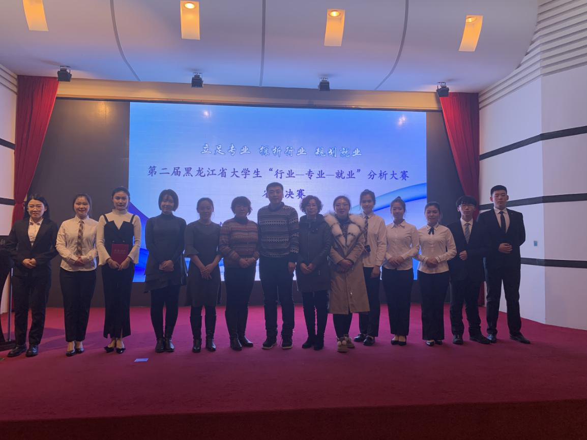 2019年12月9日—12月10日,黑龙江省第二届行业-专业-就业分析大赛在哈尔滨医科大学举行。比赛分为医药类与农学经济类两个类别。分别设置专科组与本科组。专科组入围5个参赛队伍。分别设立特等奖,一等奖,二等奖。为了提高教师职业指导能力,增强学生综合素质与就业胜任力。我系张锐书记带队,李媛媛老师作为指导教师,陈思含,张淼,郭玲玲,刘思琦,高睿琦五位学生组成参赛队伍参加此次竞赛,获得专科组一等奖,李媛媛老师被授予“优秀指导教师”荣誉称号。
