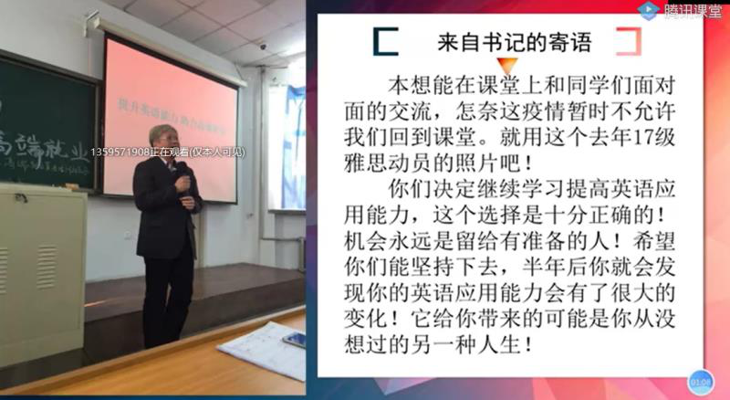 因为疫情的原因,今年的雅思培训暂时只能在线上进行,课程全部采用直播形式,云端授课。教师们克服困难,积极准备电子版教学材料,课件,创建空中课堂。孙洪波书记、王盈老师亲自返校帮助省外同学取书、邮寄,助力雅思培训顺利开展。校领导对此次培训也给予了高度关注。