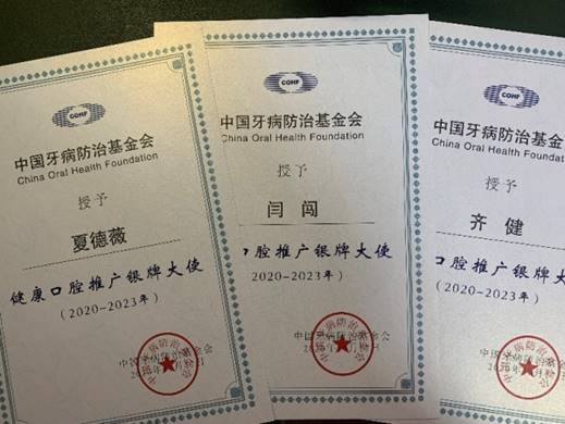 2019年度我校三名教师荣获首批“健康推广大使”称号,在“2020健康口腔大世界”开展进阶的“银牌大使”培训中,齐健、夏德薇、闫闯老师通过了进阶的理论考核及窝沟封闭、局部涂氟等实践操作考核项目,荣获“健康口腔推广银牌大使”称号。成绩的取得是口腔医学系及龙护专附属口腔门诊全体同仁共同努力的结果,更加离不开校领导及系领导的支持。