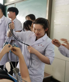 19级针灸推拿专业的学生身穿统一服装。由中医教研室主任、针推专业负责人陈铭佳主任进行毕业实习岗前培训。会议分为三个部分。第一部分:实习在即,一方面陈主任希望同学们要调整好从一名医学生到实习医生身份转变的状态,遵守医院的规章制度,谨记临床实习的注意事项,主动思考,善于提问,夯实医学知识;另一方面从专升本角度鼓励同学们努力学习,合理规划好实习与复习时间比重,期待针推专业学生专升本考试顺利通过。第二部分:为了增强同学们的临床技能,陈主任对其进行了实训操作的理论培训,内容涉及血压的测量、心电图操作方法及注意事项、心肺听诊、腹部触诊、神级系统查体;第三部分由各为老师详细指导同学们进行实际操作训练。