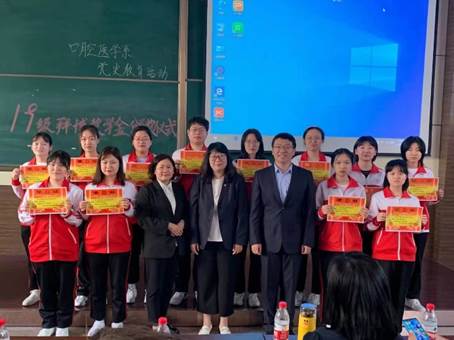 颁奖仪式开始前,由19级拜博冠名班51名学生为参加活动的老师们献歌一首——《相亲相爱一家人》,感谢学校、泰康拜博对他们的培养,感恩泰康拜博对他们学习的激励和资助。活动首先由口腔医学系马玉宏主任讲话,介绍了我系校企合作的基本情况,希望同学们在学校和泰康拜博搭建的优质平台上充分展示自己,学有所获,学有所成。之后,口腔医学系刘鹤颖书记宣读了奖学金表彰决定及获得奖学金学生名单,并对获奖学生表示祝贺,希望同学们戒骄戒躁,以这次表彰为契机,更加努力学习,早日成长为一名德才兼备的口腔职业人。接下来,由泰康拜博与会人员为获得奖学金的12名学生颁发了荣誉证书。获奖学生代表发表了真挚的获奖感言,代表全体学生对泰康拜博表示感谢,表示希望有机会能为泰康拜博的发展贡献力量。最后泰康拜博白杨女士为活动做了总结,对拜博冠名班给予了肯定,对学校表示感谢,感谢龙护专为口腔事业培养出优秀的人才,也希望通过校企合作模式,为毕业生踏入社会、施展才干搭建良好的平台。最后,全体与会人员共同为19级拜博冠名班学生颁发了纪念品。