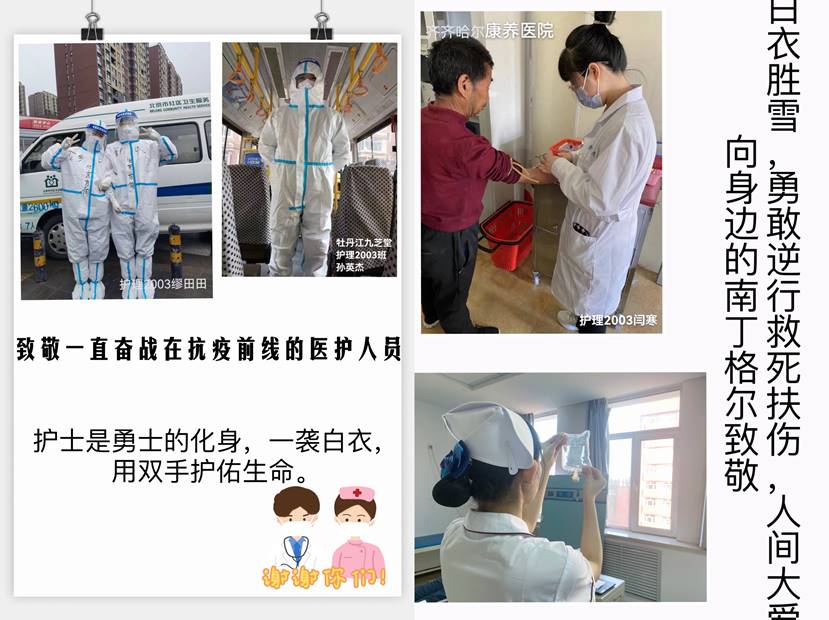 长期的疫情管控,封闭管理,为了让学生们能够正确认识到疫情管控,传播正能量,在护理系辅导员老师的带领下,同学们重温南丁格尔誓言,并坚守于心,践行于行。她们精神饱满,铿锵有力,展现出未来护理工作者的勃勃生机以及他们对护理事业的无限向往!有的同学自发组织做宣传片,在歌声中倾情演绎白衣天使的无私爱心与奉献精神,充分展示了护理人积极向上、朝气蓬勃的精神面貌和强烈的集体荣誉感!他们以独特的方式为国际护士献礼。有的同学拿起画笔和工具,在洁白的画卷上绘制护理的文化与风采,他们以文化作品的方式传达着内心真挚的情感。丰富多彩的文娱活动,极大提高了同学们的热忱。