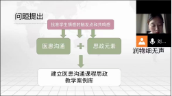 接下来,刘琬一老师向大家陈述了开题报告,主要从总体思路、研究内容、研究步骤、人员介绍与分工、研究条件保障五方面来陈述。刘老师一针见血地提出了当前医患沟通课程存在的问题,强调了建立医患沟通课程思政教学案例库的重要性和必要性,阐明了提出本课题的原因和研究价值。在会上,刘老师详细介绍了本课题的研究内容、研究思路、研究方法和预期成果,并展示了开展研究的技术路线,让整个课题的研究过程清晰易懂。刘老师还向大家说明了本课题研究的创新点,包括内容创新、视角创新、模式创新和评价标准创新,可预见本课题研究的成功对医患沟通教育教学将有深远的意义和推广价值。刘老师还介绍了本课题组的成员组成及任务分工,通过刘老师的介绍,能看出本课题组具有良好的梯队结构,具丰富的研究经验和浓厚的研究氛围,而且对课题研究各项活动都做了具体安排,分工明确。刘老师也提出了本课题研究的两点困难,一是疫情影响了临床一线医患沟通案例的采集工作,但是会通过线上的形式与临床一线专家建立联系,通过线上访谈的形式进行采集;二是案例库建设对计算机知识要求比较高,刘老师联系了专业的软件团队并得到了能够实现案例库建设构想的承诺。最后,刘琬一老师为了保证本课题能够高质量高标准完成,还特别对课题组成员提出了几点要求,一是要充分认识本课题研究的重要性,珍惜学校为大家提供的宝贵机会;二是要注重在科研过程中加强学习,有所收获;三是重视临床一线沟通案例的采集工作,因为这个环节是研究的重中之重;四是深刻理解应用性研究的含义,要注重对研究成果的应用和推广;五是要在研究过程中逐渐思考、建立和完善评价指标。课题组成员邢岩老师和伊芯老师对开题报告做了相关补充,分别从医患沟通任课教师角度和外科学任课教师角度说明了医患沟通课程课程及案例库建设的重要性和必要性。