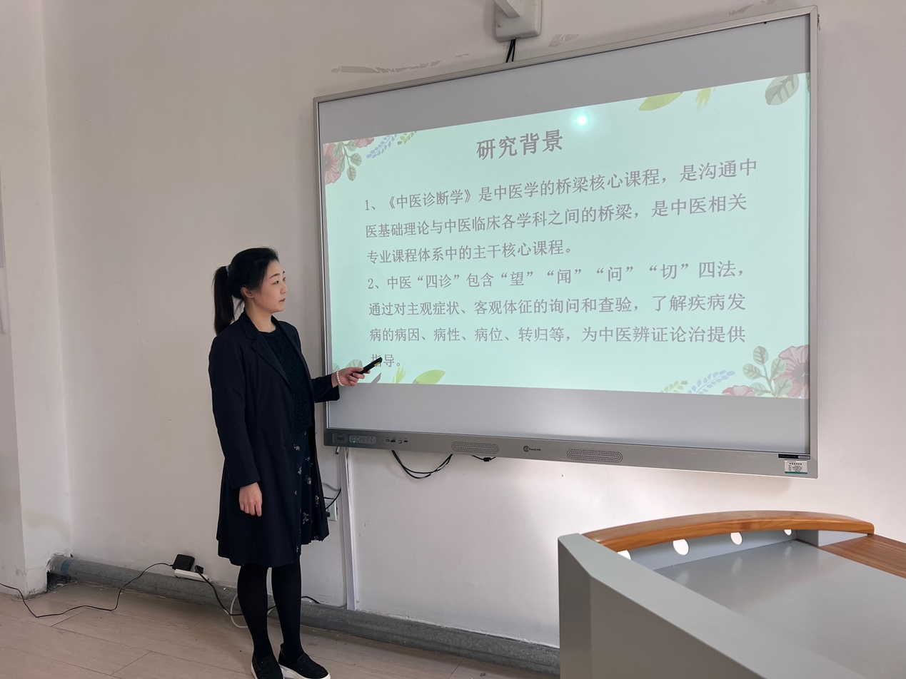 课题主持人吴穷进行备案项目《PCMC 教学法联合创新实践实训平台在四诊实训中的应用研究》汇报,对课题的研究背景、研究目的、研究价值、研究内容、研究方法,以及课题突破及创新点一一进行说明。该课题充分结合专业知识结构和职业能力结构,改革中医“四诊”实践教学流程,通过开展PCMC 教学法联合创新实践实训平台在“四诊”实训课程中的应用研究,提高学生对“四诊”理论知识的学习兴趣,改变学生们的临床思维,提高发现问题、解决问题的应变能力,促使学生从书本的理论知识到临床的实践应用做到有效过渡,培养具有知识、技能、创新和健全人格的高素质人才。