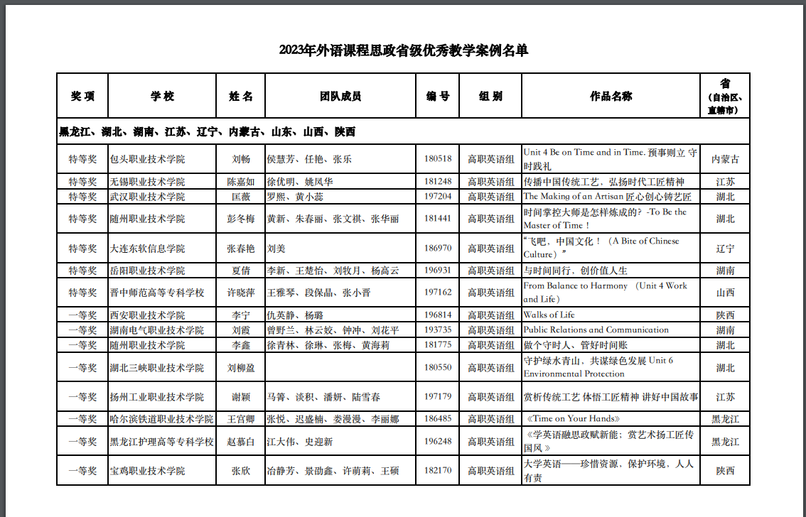 在由高等教育出版社、全国高校教师网络培训中心与中国外语编辑部共同开展的2023年外语课程思政优秀教学案例交流活动中,我校国际教育部赵慕白、江大伟、史迎新组成的英语教学团队表现优异,取得九省联赛一等奖。(黑龙江、湖北、湖南、江苏、内蒙古、山东、山西、陕西)
