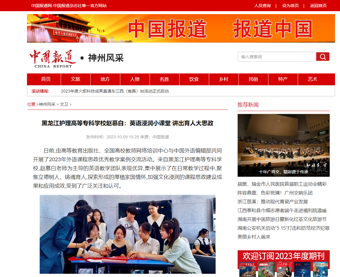 她们在日常教学过程中集中展示了:聚焦立德树人、铸魂育人,探索形成的厚植家国情怀,加强文化浸润的课程思政建设成果和应用成效,受到了广泛关注和认可并被中国报道网和中视网宣传报道。